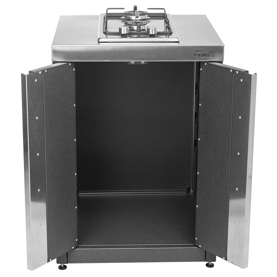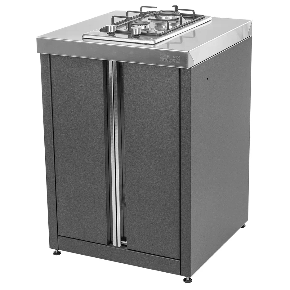 Ширина - 600 мм Глубина - 600 мм Высота - 850 мм Вес модуля - 38 кг Столешница выполнена из пищевой нержавеющей стали. Каркас модуля выполнен из холоднокатаной стали с полимерно-порошковым покрытием. В комплектации с модулем идет встраиваемая варочная поверхность с двумя конфорками Krona. Двери модуля закрываются на магнитные фиксаторы. Ручки дверей сделаны из текстурированной нержавеющей стали.