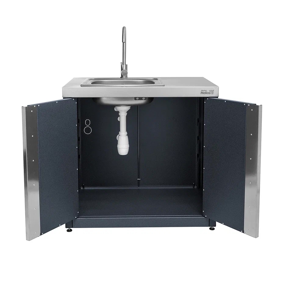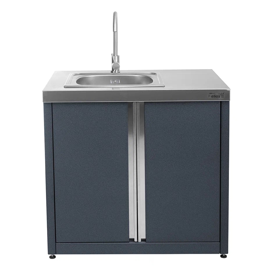 Ширина - 900 мм Глубина - 600 мм Высота - 850 мм Вес модуля - 46 кг Столешница выполнена из пищевой нержавеющей стали. Каркас модуля выполнен из холоднокатаной стали с полимерно-порошковым покрытием. В комплектации с модулем идет глубокая встроенная мойка (сифон и смеситель в комплект не входят). Двери модуля закрываются на магнитные фиксаторы. Ручки дверей сделаны из текстурированной нержавеющей стали.