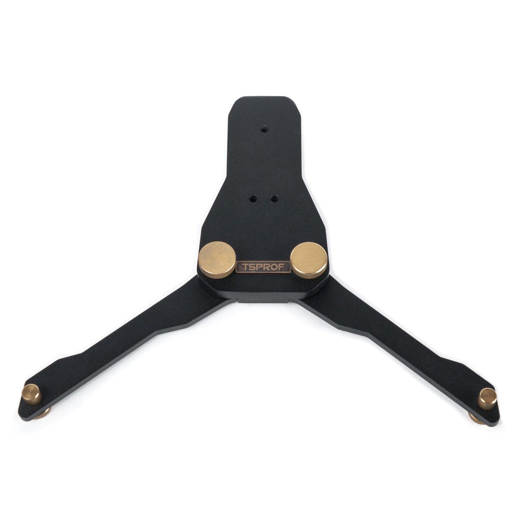 Складная подставка для заточного устройства TSPROF Pioneer. Предназначена для устойчивой фиксации устройства на поверхности стола. Подставка изготовлена из стали, с выдвижными опорами, окрашена в черный цвет с винтами золотистого цвета. Головки винтов имеют накатку для ручного затягивания.