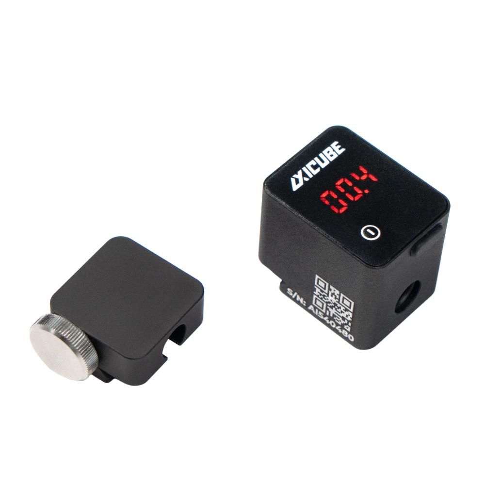 Быстросъемный электронный угломер Axicube-i в корпусе со съемным аккумулятором. Угломер располагается на дальнем упоре штанги, с возможностью быстро устанавливать и снимать его для уменьшения нагрузки на абразив при работе и для удобства зарядки в удаленном от системы заточки места. Крепление на планку пикатинни, в сочетании со стопорным винтом и магнитом обеспечивает лёгкую и надёжную фиксацию угломера для точных измерений угла заточки. Зарядка устройства осуществляется через разъем USB type-C.