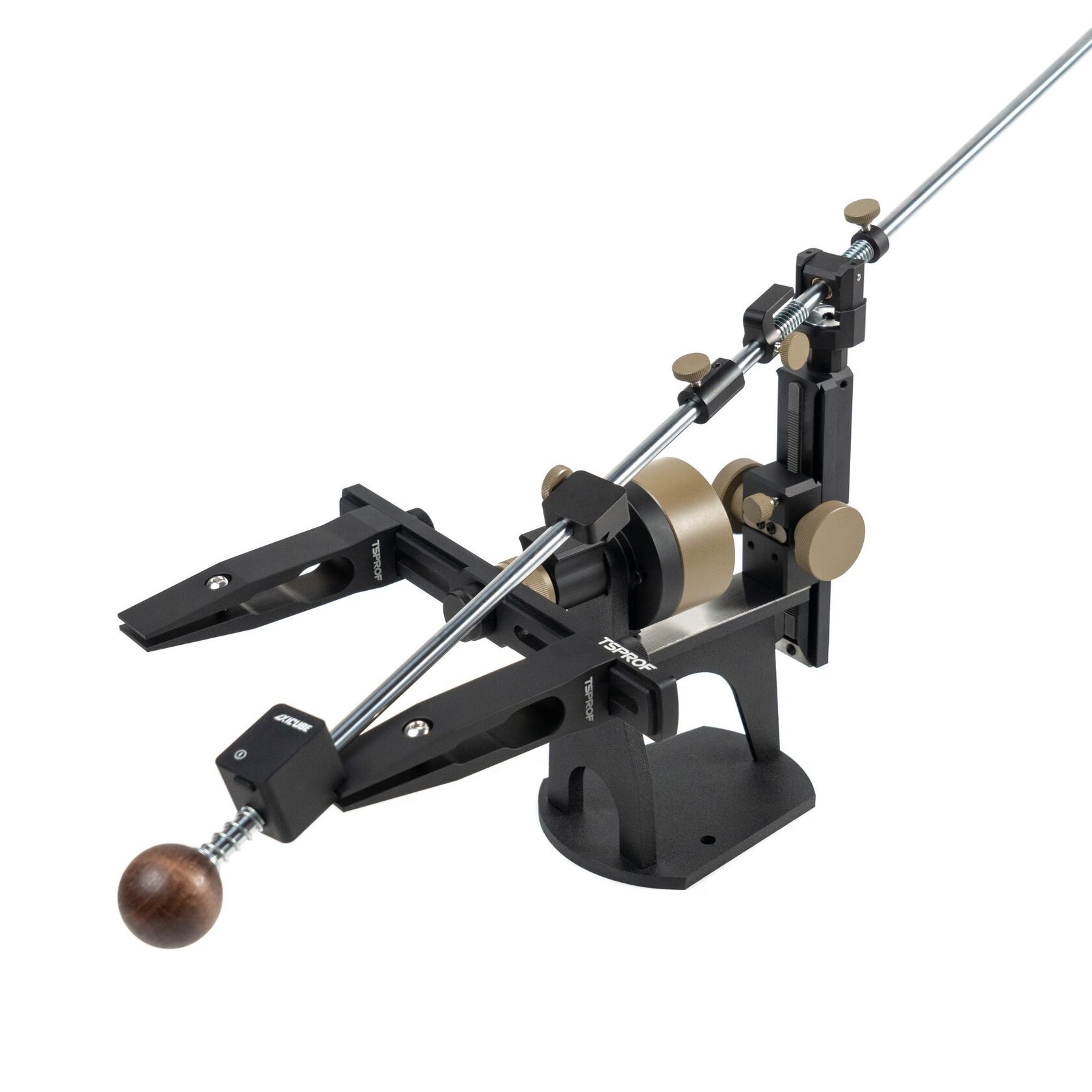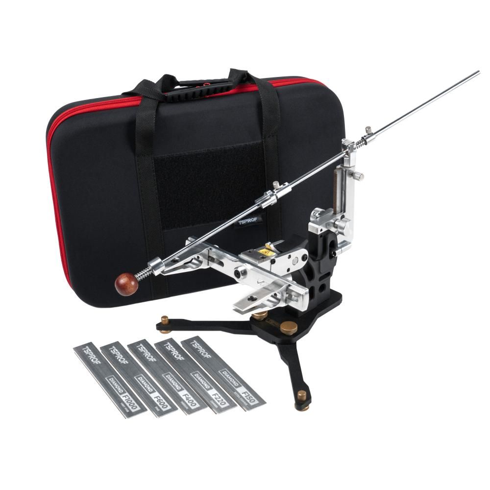 Система для заточки ножей TSPROF Pioneer — это надежный и практичный помощник для домашней заточки ножей. Простота в работе, и интуитивно понятное расположение элементов сочетается в ней со стильным внешним видом: Универсальные зажимы позволяют затачивать складные, кухонные, туристические ножи и мультитулы. В зависимости от размера лезвия зажимы можно перемещать в пазах рамки. Поворотный механизм точилки TSPROF Pioneer помогает сохранить одинаковый угол заточки на обеих сторонах ножа. Рычаг переворота, после установки необходимого угла, позволяет надежно зафиксировать крепление поворотного узла. Допустимая погрешность при перевороте рамки составляет 0,4°. Ось настройки угла, плавно движется внутри рамы, фрезерованной из сплава авиационного алюминия. При помощи резинового кольца можно легко отследить и скомпенсировать изменение угла заточки при работе абразивами различной толщины.