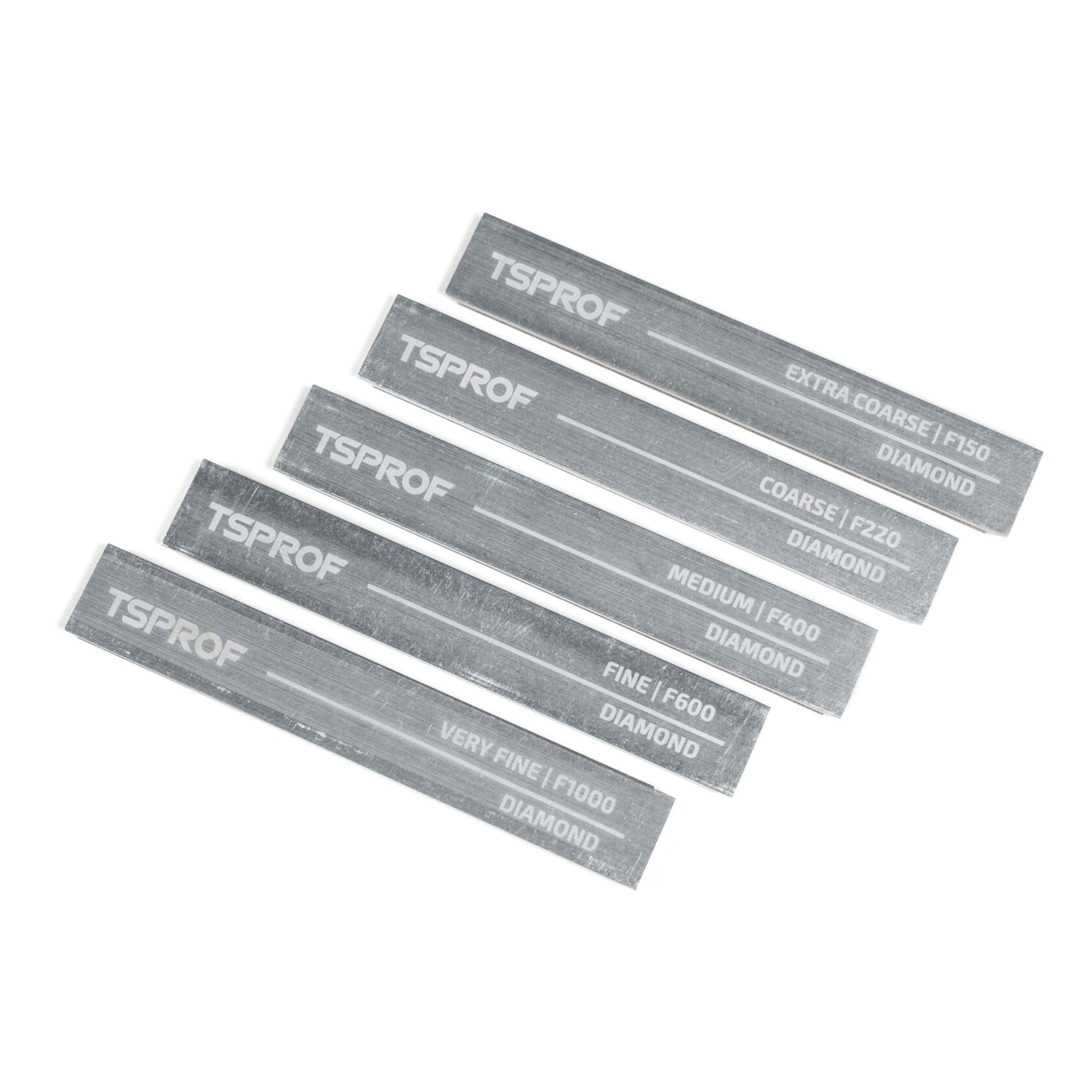 В набор входят бруски: TSPROF Alpha 60/40 (240 грит) предназначен для основной заточки режущей кромки. TSPROF Alpha 28/20 (600 грит) предназначен для основной заточки режущей кромки. TSPROF Alpha 14/10 (1500 грит) предназначен для предфинишной доводки режущей кромки. TSPROF Alpha 7/5 (3000 грит) предназначен для финишной доводки режущей кромки TSPROF Alpha 3/2 (9000 грит) предназначен для финишной доводки и полировки режущей кромки